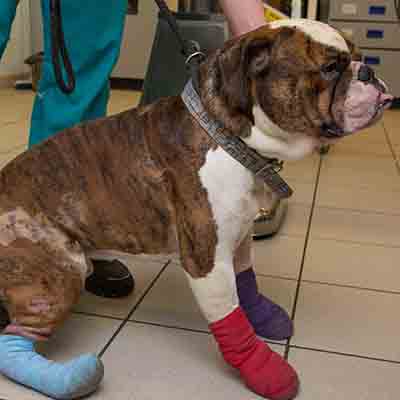 Leo’s burns covered his legs and stomach and the poor pooch had suffered an enormous amount of stress. PDSA vets worked tirelessly on Leo to save his legs – they even had to cut away his paw pads after plastic from the caravan got melted to them.