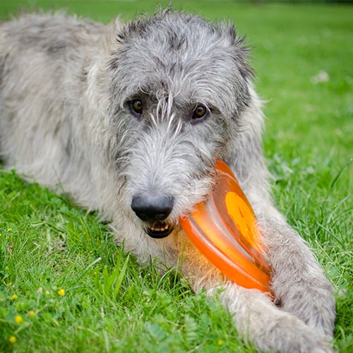 Your Irish Wolfhound will need a minimum of two hours of exercise every day to keep them fit and healthy. It’s better to spread this across the day rather than doing two hours in one go. We’d recommend splitting this into walks and off-lead exercise in a safe area. Make sure that at least one of your walks gives your dog chance to have a good sniff and nose around. On top of this, your Wolfhound will need plenty of playtime and training sessions along with free time in the garden for a bit of variety. Because of their large size and quick growth, you’ll need to take exercise easy while they are a puppy – you can read more on our website.